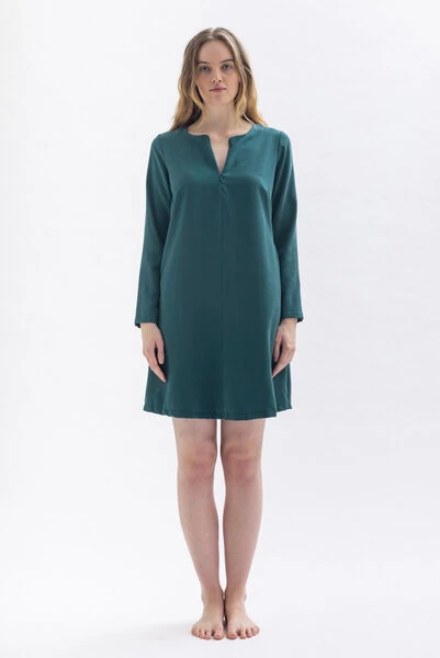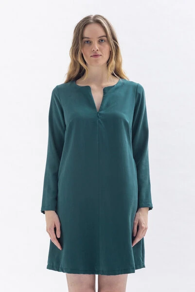 Dieses Sommer/Herbst/Winter/Frühlingskleid aus fließendem Tencel von Studio Hertzberg wurde fair in Deutschland produziert. Das Kleid ist locker geschnitten und besitzt eine Knie Länge.