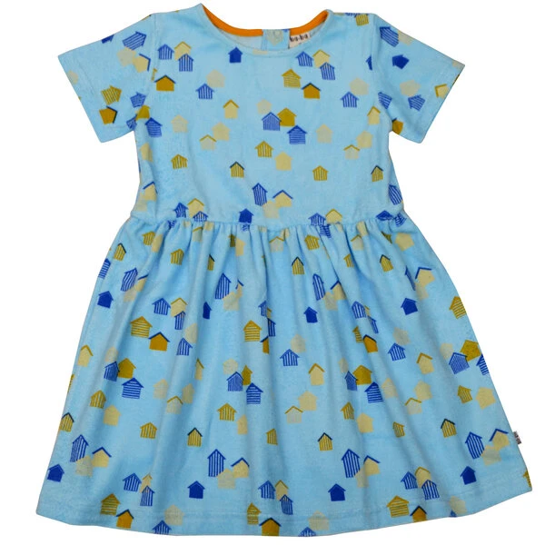 Baba Kidswear Frottee Kleid mit dunkelblauen und senffarbenen Strandhäuschen hellblau– Bio-Baumwolle