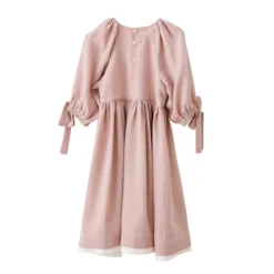 Ein bezauberndes Babydoll-Kleid von zimt&grün in einem wunderschönen Altrosa mit herrlichen Highlights. Puffärmel mit Schleifen, eine erhöhte Taillennaht vorne, der geraffte Rock und der weiße Saum aus Bio-Baumwolle sind hübsche Details, die sofort ins Auge fallen. Am Rücken mit drei Muschelknöpfen zu schließen und ein feiner Perlmutt-Knopf mit Logogravur runden das Kleid mit liebevoller Finesse ab.