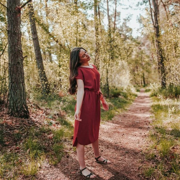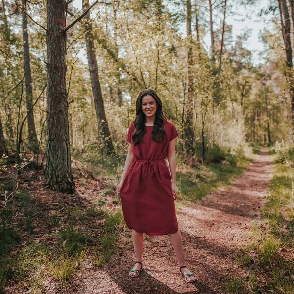 | Das Kleid ist locker geschnitten und kann mit einem Band tailliert werden. An den Seiten befinden sich Einschubtaschen.