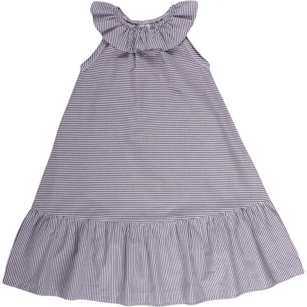 Toller gewebter Streifen in weiß/hellblau: langes, weit geschnittenes Sommerkleid ohne Arm mit Rüschenvolant am Ausschnitt und einer Stufe im Rockteil!