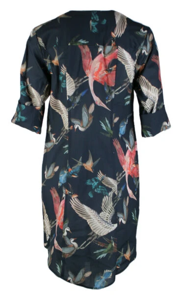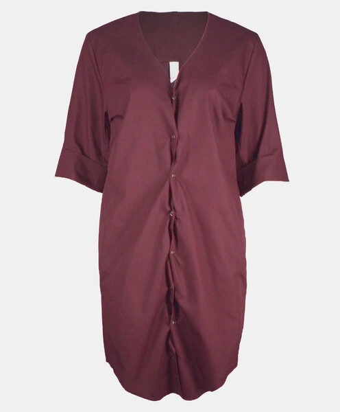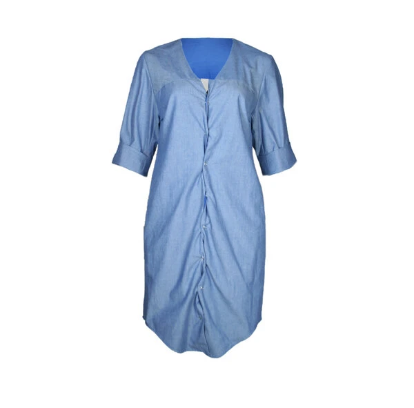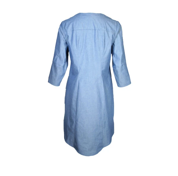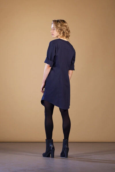Das ILSE Kleid von format ist ein gerade geschnittenes Hemdblusenkleid mit versetzt geschlossener Knopfleiste. Die Druckknöpfe sind abwechselnd angeordnet, sodass eine Art Flechteffekt entsteht. Es gibt Nahttaschen in den Seiten. Der geschwungene Saum ist seitlich etwas kürzer. Statt Brustabnähern formen Falten, die in der Seite münden die Weite im oberen Vorderteil. Das Material wurde von einem zertifiziertem Hersteller produziert