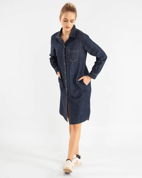 Geschnitten ist das Kleid im langen Hemdblusenstil: mit kleinem Kragen, Schulterpasse, angesetzten Ärmeln, durchgehender Druckknopfleiste, aufgesetzter Brusttasche und zwei Seitentaschen. Im Rücken sorgt eine Kellerfalte in der Passe ebenso für ein Plus an Bewegungsfreiheit, wie die beiden seitlichen Schlitze. Mit den durchgehenden Druckknöpfen kannst du den Style im sattblauen Denim-Look sowohl als Kleid oder auch als lange Jacke tragen – das macht es zu einem tollen Basic für deine Capsule Wardrobe.