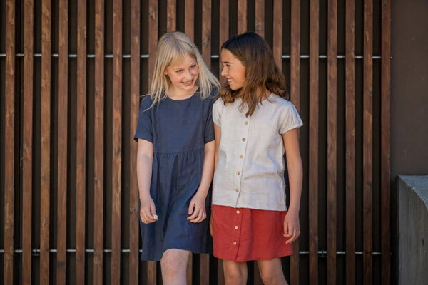 Ausschnitt mit Holzknopfverschluss hinten. Fair produziert in Portugal.