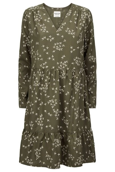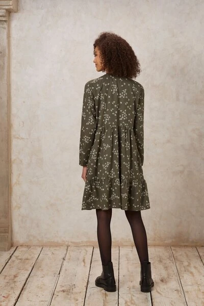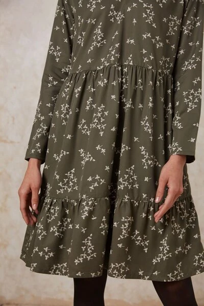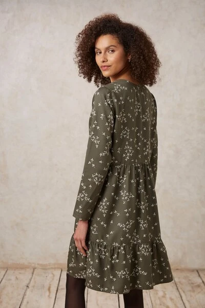 Feminines Kleid aus nachhaltigem Lyocell (Tencel) mit verspieltem Flair und schönem Blättermuster in einem herbstlichen Khaki. Die Volants im Rock schmeicheln der Figur. Das Kleid ist knielang und passt sowohl für ein Büro-Outfit als auch mit Sneakers und einer Strickjacke zum Stadtbummel mit Frühstück.