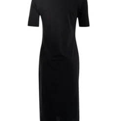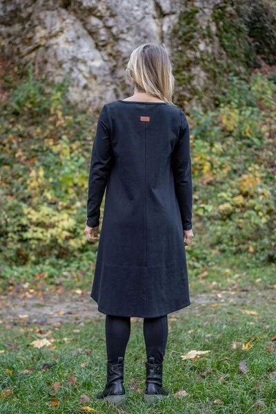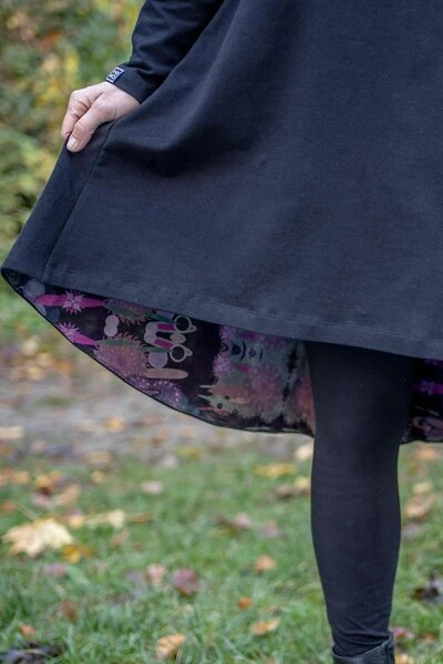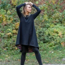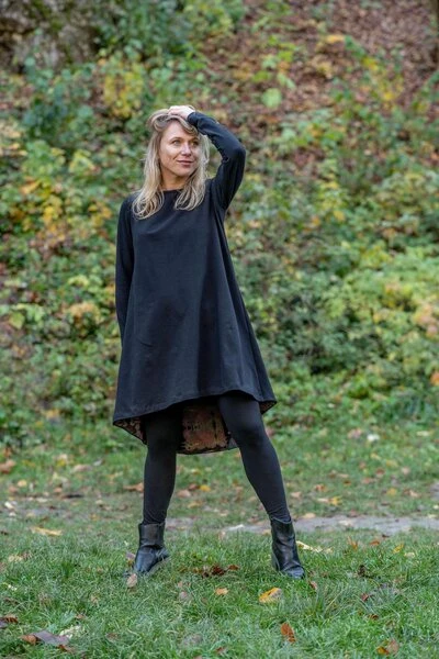 Trapezkleid mit origineller und überraschender Verarbeitung. Der verlängerte Rücken, der mit einem Stoff mit Autorenaufdruck gefüttert ist, zieht die Blicke auf sich, und die richtig gewählte Form verlängert die Silhouette.
