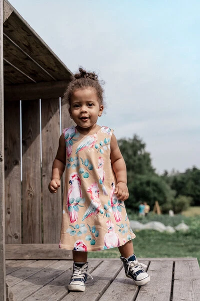 1 Kleid = 2 Styles! Das Kleid mit tropischen Kakadu sieht nicht nur zauberhaft aus, sondern ist dabei super praktisch! Das Kleid kann man von beiden Seiten ganz bequem tragen. Im Schulter Bereich hat das Kleidchen je zwei Druckknöpfe. Das Kleid sitzt locker und hat eine angenehme Länge.