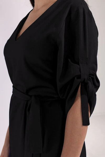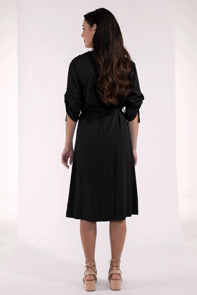 Knielanges Kleid mit gerafften Ärmeln und Gürtel Viskose blau oder schwarz