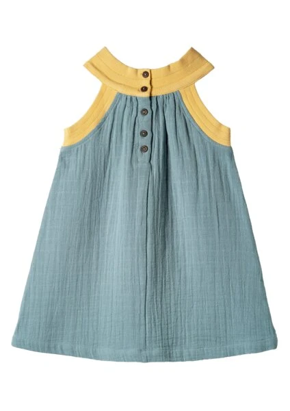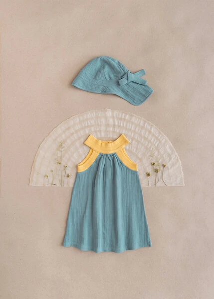 Weiches, zartes, natürliches Sommerkleid in der perfekten Kombination von Stoffen und Farben für einen stilvollen und bequemen Look.