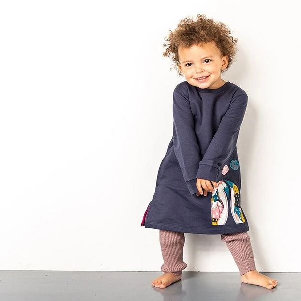 Blaues Sweat Kleid mit langen Armen und süßer Pinguin Applikation.