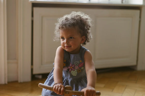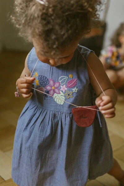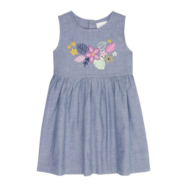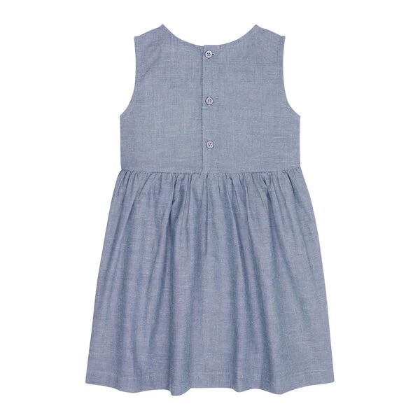 Ärmelloses Kinder Sommerkleid aus 100% Baumwolle (Bio), Chambray-Webstoff, Rundhalsausschnitt, mit drei Knöpfen im Nacken zu schliessen, auf Brusthöhe gerafft – fällt dann in einer eleganten A-Linie ab. Die Länge des Kleides reicht bis zu den Knien. Natürliches Design in Hellblau mit üppiger Blumenstickerei auf der Vorderseite.