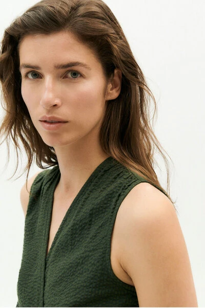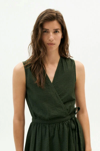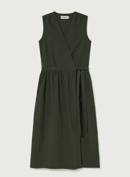 Das Kleid aus Bio-Baumwolle hat einen V-Ausschnitt und Wickeloptik. Die Schleife auf der Taille und der locker fallende Rock machen eine schöne Silhouette. Das Kleid ist perfekt für warme Sommertage oder festliche Anlässe. Das Seersucker Gewebe gibt dem Kleid eine weiche, kreppartige Struktur.