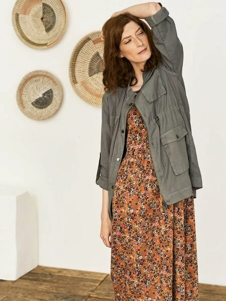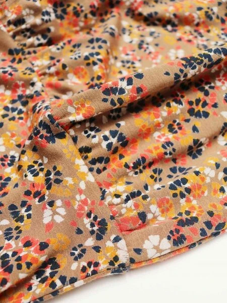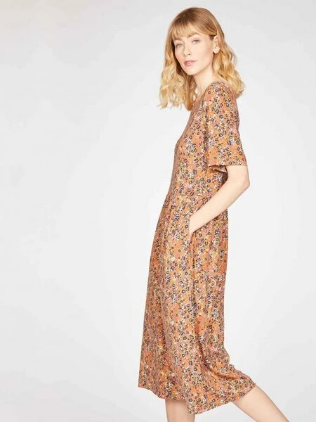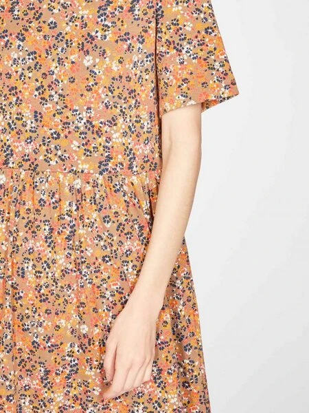 Sommerliches Midi-Kleid von THOUGHT aus zimtfarbenem Jersey Stoff mit Blumenmuster. Das Kleid ist schlicht und dennoch verspielt und kann perfekt mit einer Jeansjacke oder einem Cardigan kombiniert werden. Durch den lockeren Schnitt und die kurzen Ärmel ist das Kleid ideal für jede Figur. Der Jersey Stoff besteht aus 67% Bambusviskose, 28% Bio-Baumwolle und 5% Elasthan und ist besonders weich und atmungsaktiv.